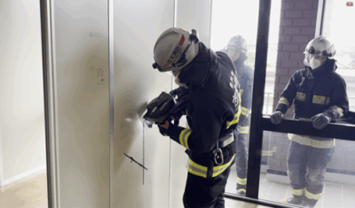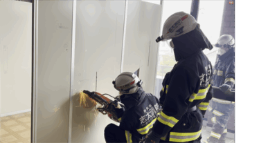 志太消防本部南分署では、2025年10月31 日(金曜日)から11月2日(日曜日)までの3日間、仮眠室個室化により撤去予定のパーテーションを、解体業者様の了承を得て、エンジンカッター及び電動チップソーにて切断訓練を実施しました。 パーテーションは厚みが約4センチあり、段ボールを薄い鉄板で挟んだ構造となっています。これは住居の玄関ドアと同じ構造であり、パーテーションを住居の玄関として見立て、施錠された玄関ドアを切断し、ドアを開放するという想定のもと一連の流れを確認しました。 志太消防本部南分署にはエンジン駆動のエンジンカッターとバッテリー駆動の電動チップソーが配備されており、各資機材のメリット及びデメリットを再確認しました。