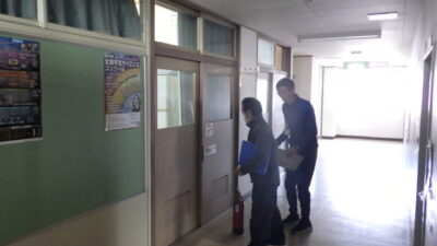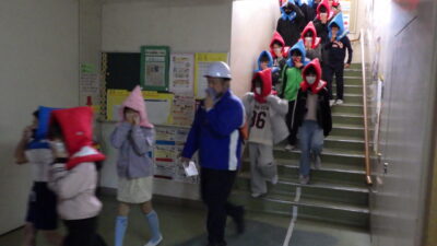 訓練では、ベルの鳴動に対して教員が自動火災報知設備の受信機にて火災発生場所を確認し、消火器を持参し火災発生場所に駆け付けた教員が事務室に火災の状況を伝え、事務室の放送設備にて教職員及び児童に周知し、グラウンドへの避難が行われました。