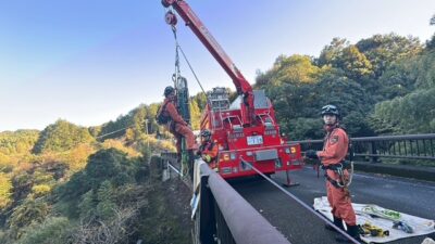 本訓練は、高さ約20mの橋上から降下する訓練と宙吊りになっている要救助者を救出する想定訓練を実施しました。