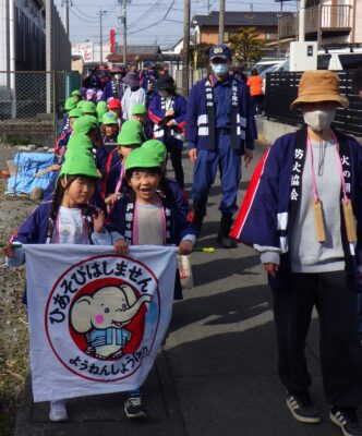 2026年3月1日から7日にかけて実施される春季全国火災予防運動の前に、藤枝市立前島保育園と志太消防本部が『火の用心』を呼びかけて防火パレードを実施しました。