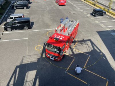 消防車両では、幹線道路などの広い道路だけでなく、狭い道路も走行する必要があるため、複数の想定により、狭い道路での走行技術や車両感覚の向上、誘導員との連携による運転者の死角の危険回避能力の向上を図りました。